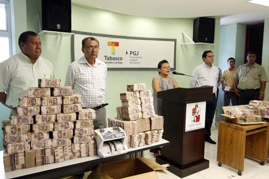 El procurador Fernando Valenzuela Pernas informó que el dinero era trasladado en cajas de cartón del despacho contable del ex secretario de Finanzas José Saiz Pineda a una casa en el municipio de Nacajuca.