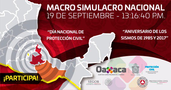 La Coordinación Estatal de Protección Civil de Oaxaca (CEPCO) anunció que la entidad participará, el próximo 19 de septiembre, en el macrosimulacro que se realizará a nivel nacional, en el marco de la conmemoración de los sismos de 1985 y 2017 que impactaron al país.