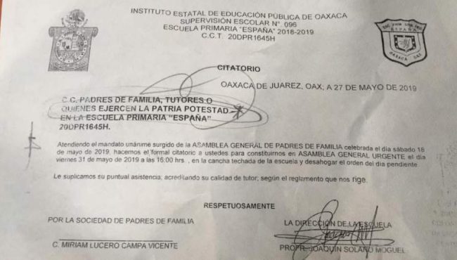 De acuerdo con la presidenta de los padres de familia, Miriam Lucero Campa Moguel, el pasado 27 de mayo el profesor afiliado a la Sección 22 del SNTE emitió una convocatoria sólo con su firma, para citar a una asamblea urgente ayer.