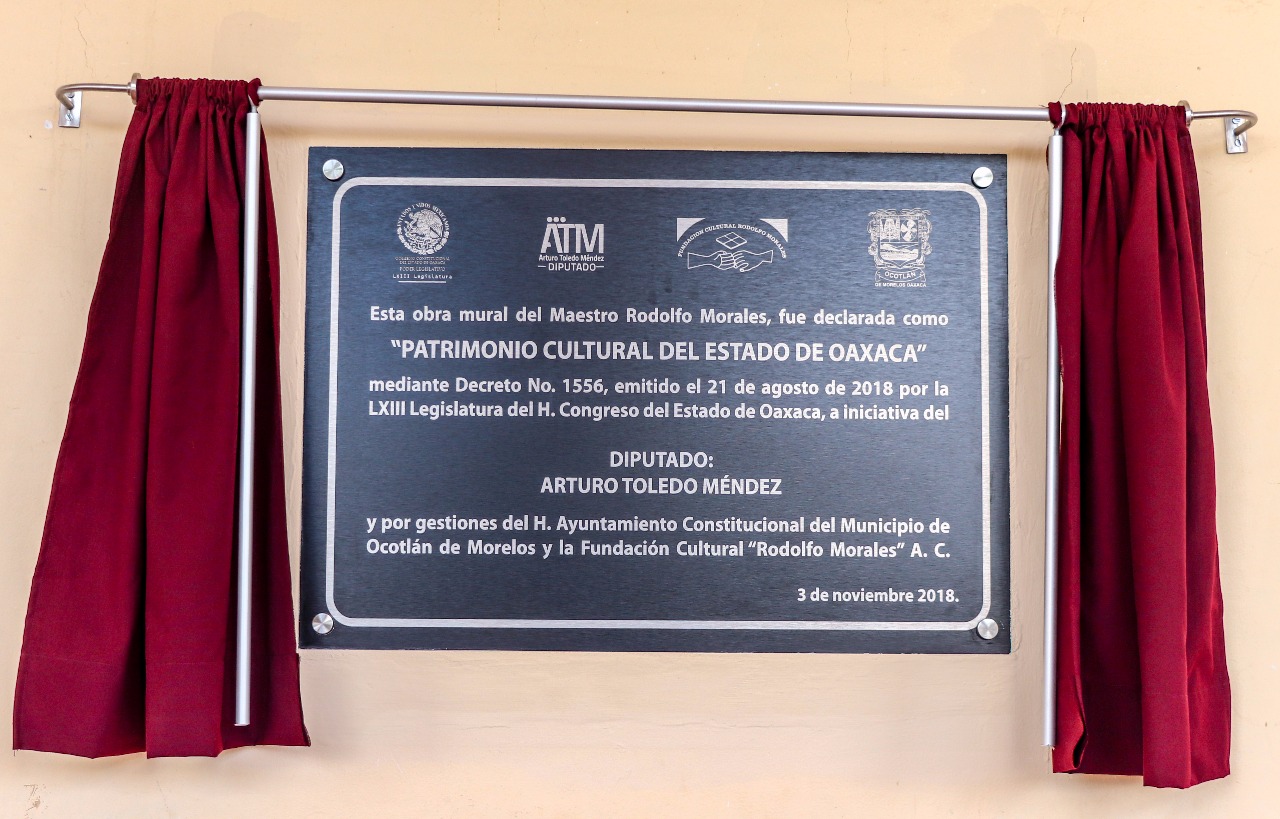 La Secretaría de las Culturas y Artes de Oaxaca (Seculta) a través de la titular, Adriana Aguilar Escobar, develó la placa que oficializa la declaratoria como Patrimonio Cultural del Estado de Oaxaca al mural del Maestro Rodolfo Morales que se ubica al interior del Palacio Municipal de Ocotlán de Morelos.