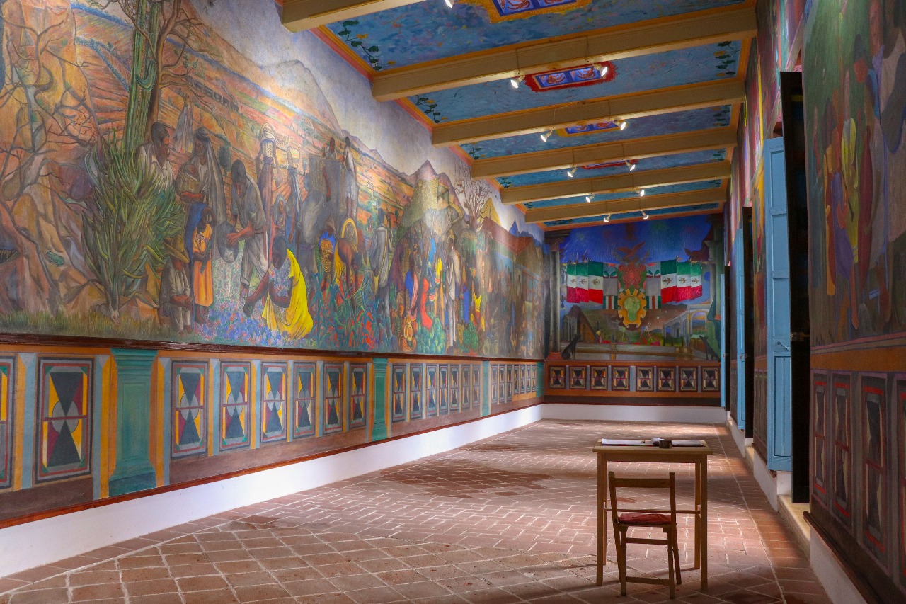 El mural se ubica al interior del edificio que ocupa el palacio municipal de Ocotlán de Morelos.