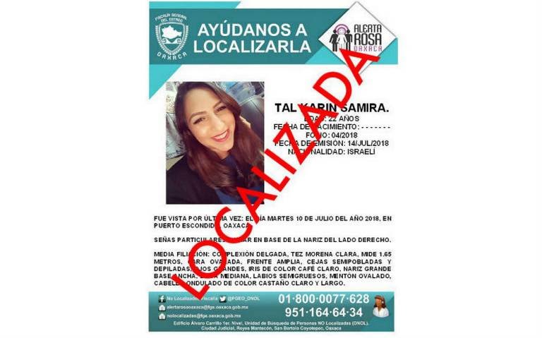 La embajada de Israel en México informó que la ciudadana israelí Tal Karin Samira, fue localizadacon vida luego de que su familia y la Fiscalía del Estado de Oaxaca la reportaran como desaparecida el pasado 10 de julio en esa entidad.